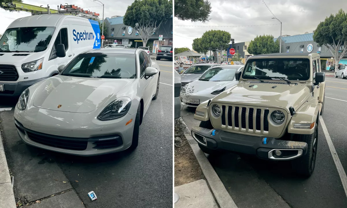Hai chiếc xe sơn tông màu đất trầm: Porsche Panamera (trái) và Jeep Wrangler, cùng đỗ bên lề trên đại lộ Larchmont, Los Angeles, hôm 13/2. Ảnh: Los Angeles Times.